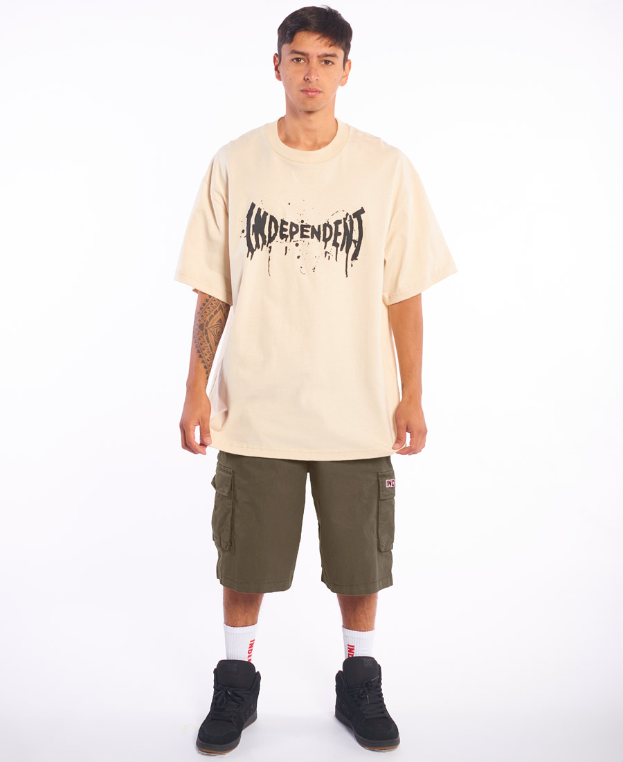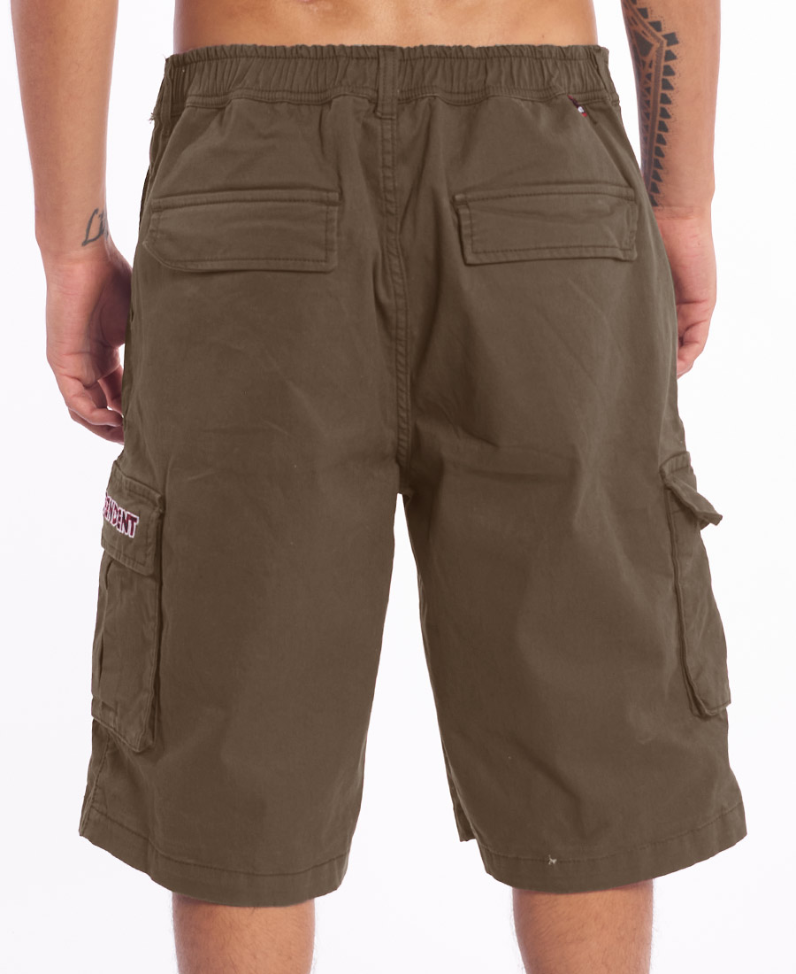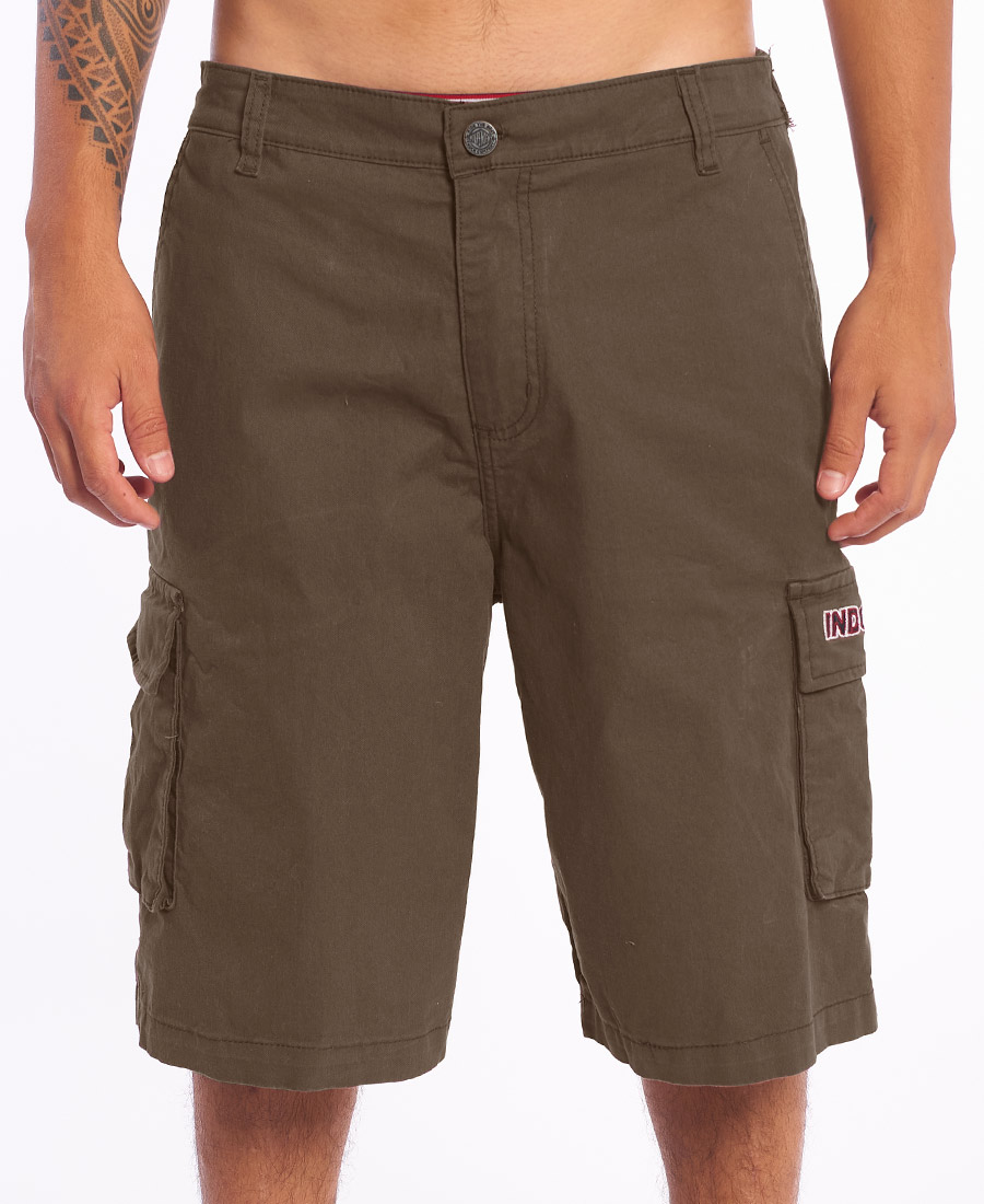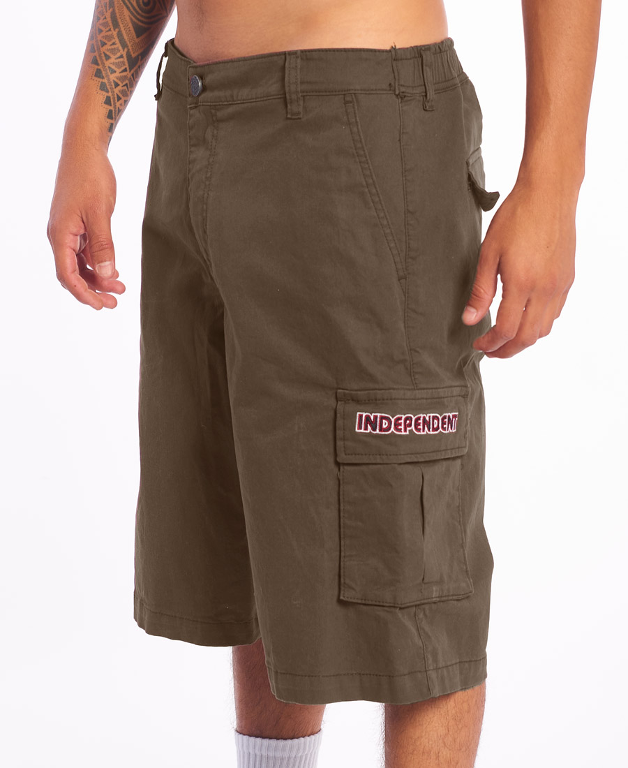 Bermuda Independent Groundwork. GABARDINA 7oz. 98% ALGODON 2% ELASTANO. LOOSE FIT 23”. Etiqueta de marca/talle. 5 bolsillos, más bolsillos cargo en laterales.Cordón marcario con salida al lado interior de la prenda. Presillas de 2cm. Soft wash.Botón metálico marcario. Grifa de marca. Bordado en tapa de bolsillo cargo izquierdo.