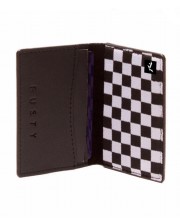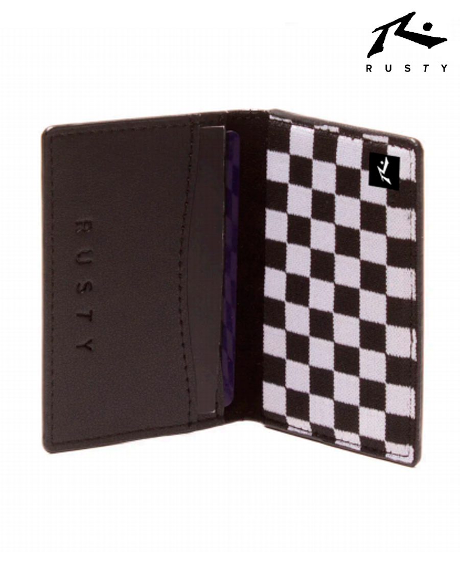 Billetera Rusty Exactly Crupier, tarjetero de cuero sintético con detalles en el interior elástico en cuadrille blanco y negro.
