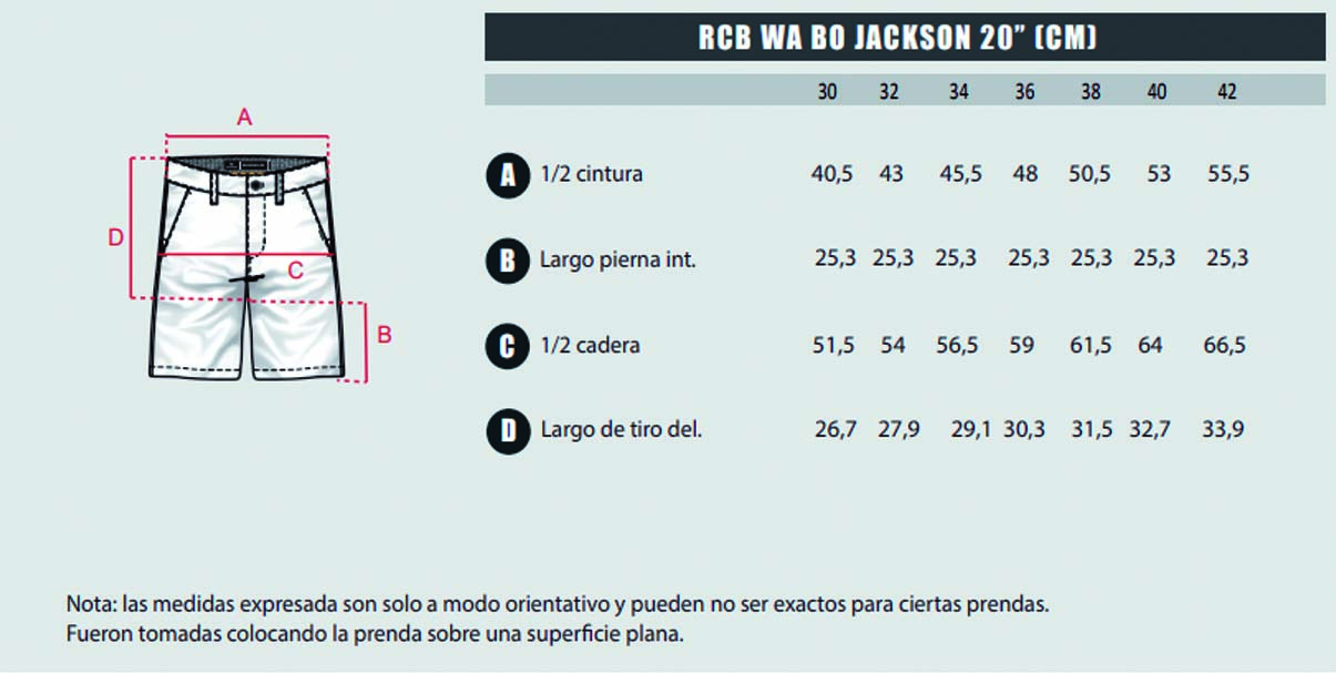 Boardwalk Rip Curl Jackson 20 pulg. Standard fit. Largo lateral 20” (50.8 cm). Multietiquetas bordadas. Botones diseno unico. 66% Polyester 26% algodon 8% Elastano. Algodon strech.