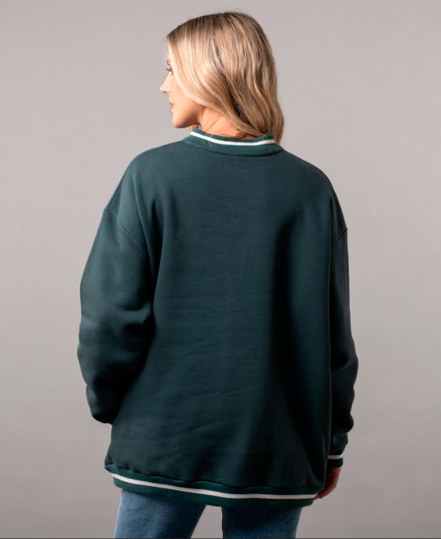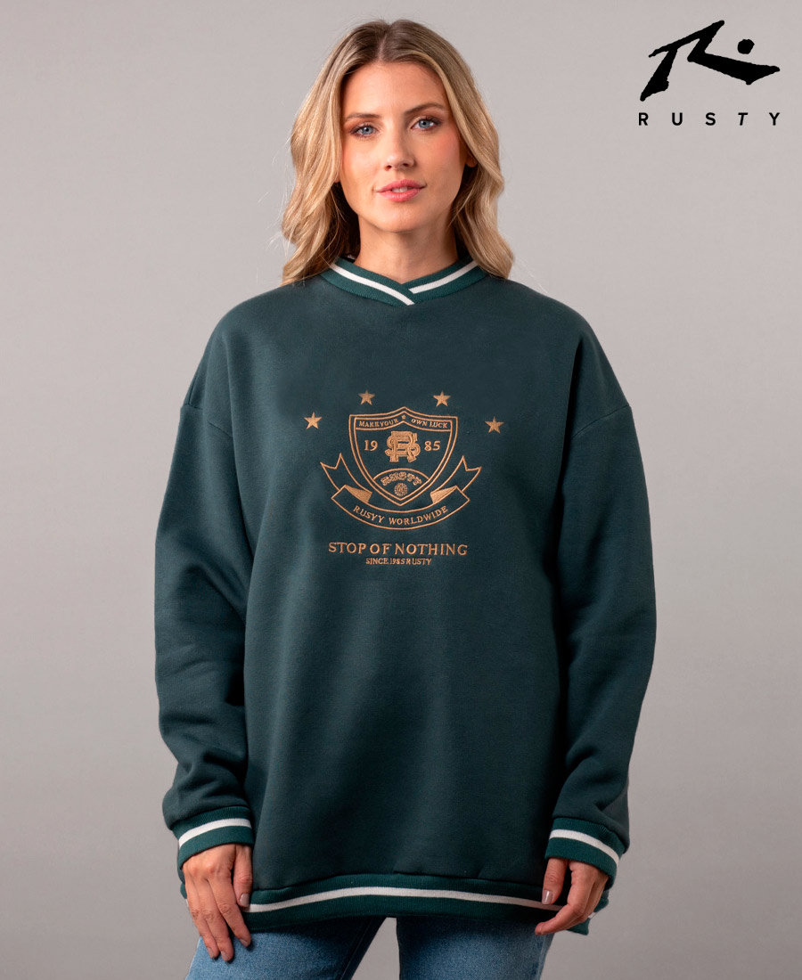 Buzo Rusty South Over de cuello en V holgado con bordado frontal. 58 % poliéster / 42 % algodón. Corte holgado oversize. Bolsillos laterales.