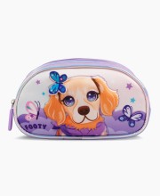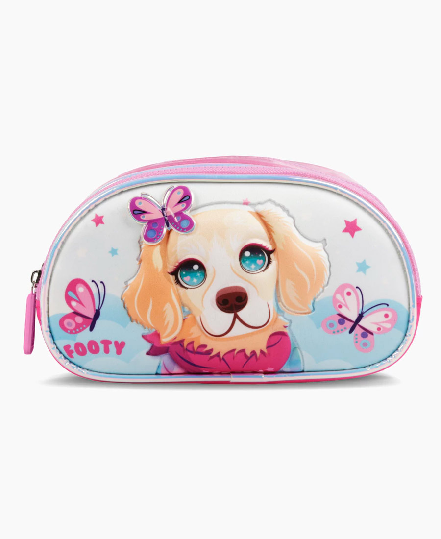 Cartuchera Footy Doggie Love. Cartuchera dos cieres con tiracierre de rubber. Estampa sublimada. Frente con aplique mariposa en relieve.