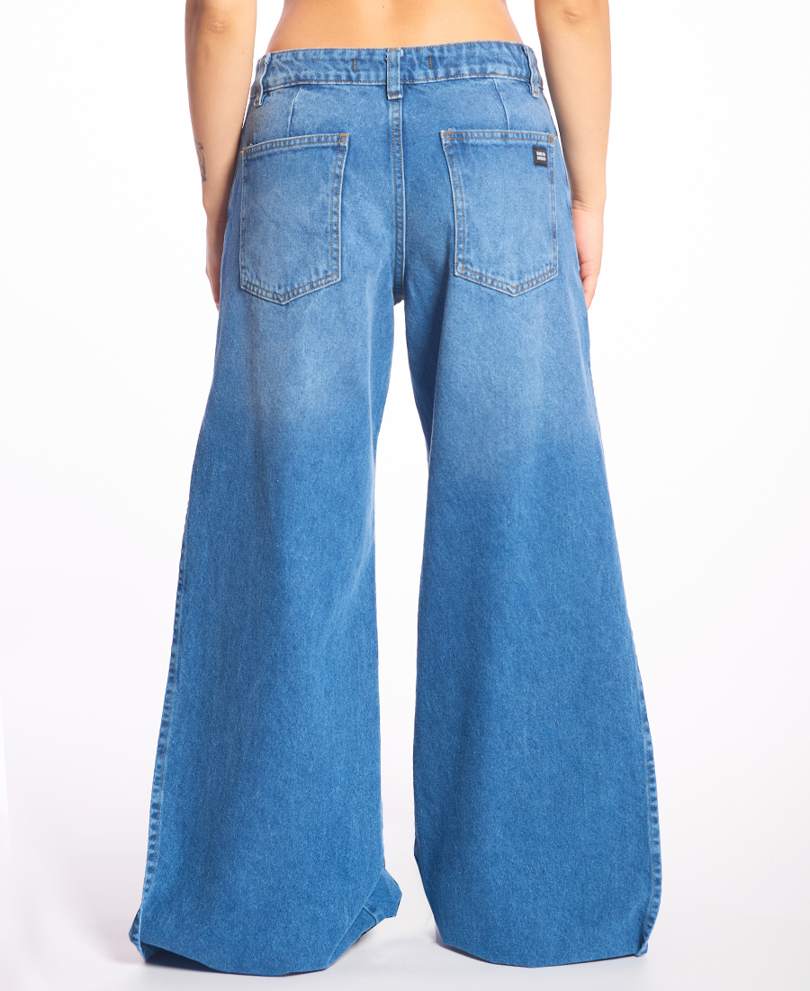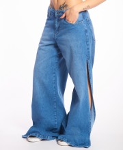 Jean Isabel La Católica Wide Tajo WIDE FIT. Etiqueta Marca/talle. Lavado localizado, bigotes. Tajos en lateral Hilo Camel. Grifa de marca