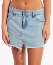 Pollera Rip Curl Destroy Blue. DENIM RIGIDO ∙ Calce relax. ∙ Tiro medio. ∙ Ruedos desflecados. ∙ Lavado bajada de color. ∙ Botón y remaches oro viejo. ∙ Multietiquetas