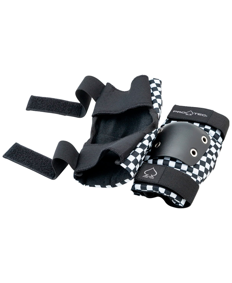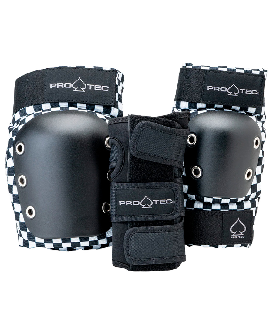 Protecciones Pro Tec Street Gear 3 Pack. El juego de protecciones fue diseñado y fabricado con nailon resistente a la abrasión, tapas de plástico duraderas, paneles elásticos de neopreno y un cómodo acolchado de EVA. Cuentan con un sistema de cierre de velcro. El juego viene en una bolsa de malla reutilizable para mantenerlos juntos cuando no se usan. Además, se reduce el desperdicio de embalaje, lo que beneficia al medio ambiente.