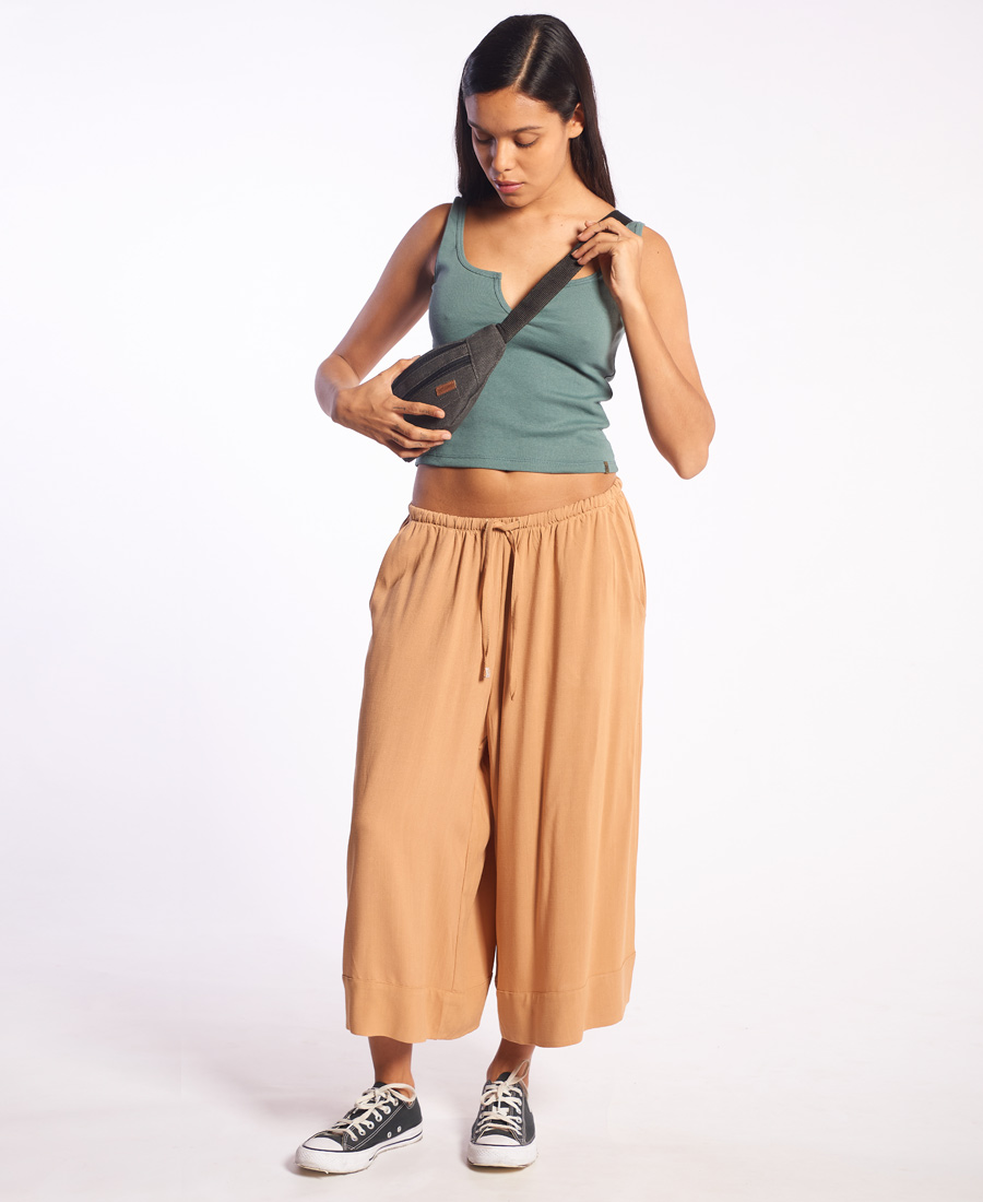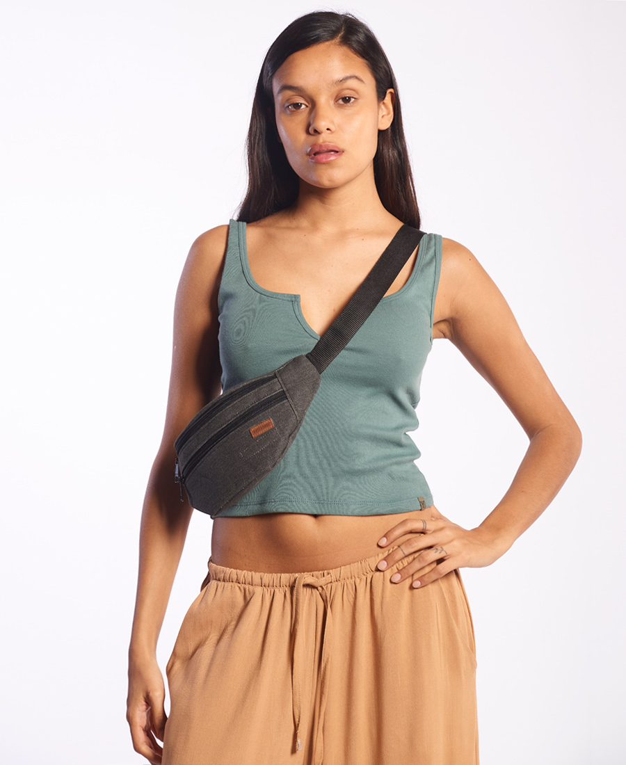 Riñonera Y Tú Quique? en canvas y algodón, doble compartimiento, correa ajustable.