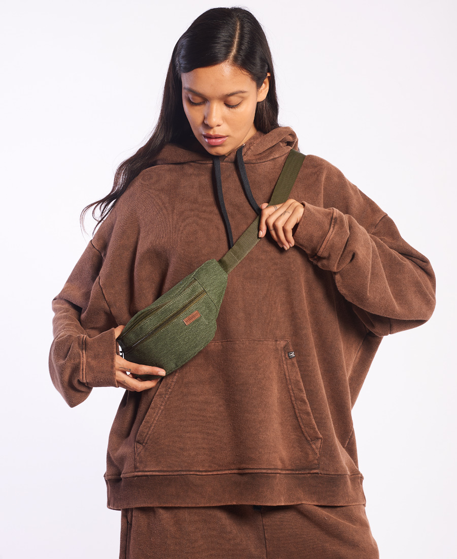Riñonera Y Tú Quique? en canvas y algodón, doble compartimiento, correa ajustable.