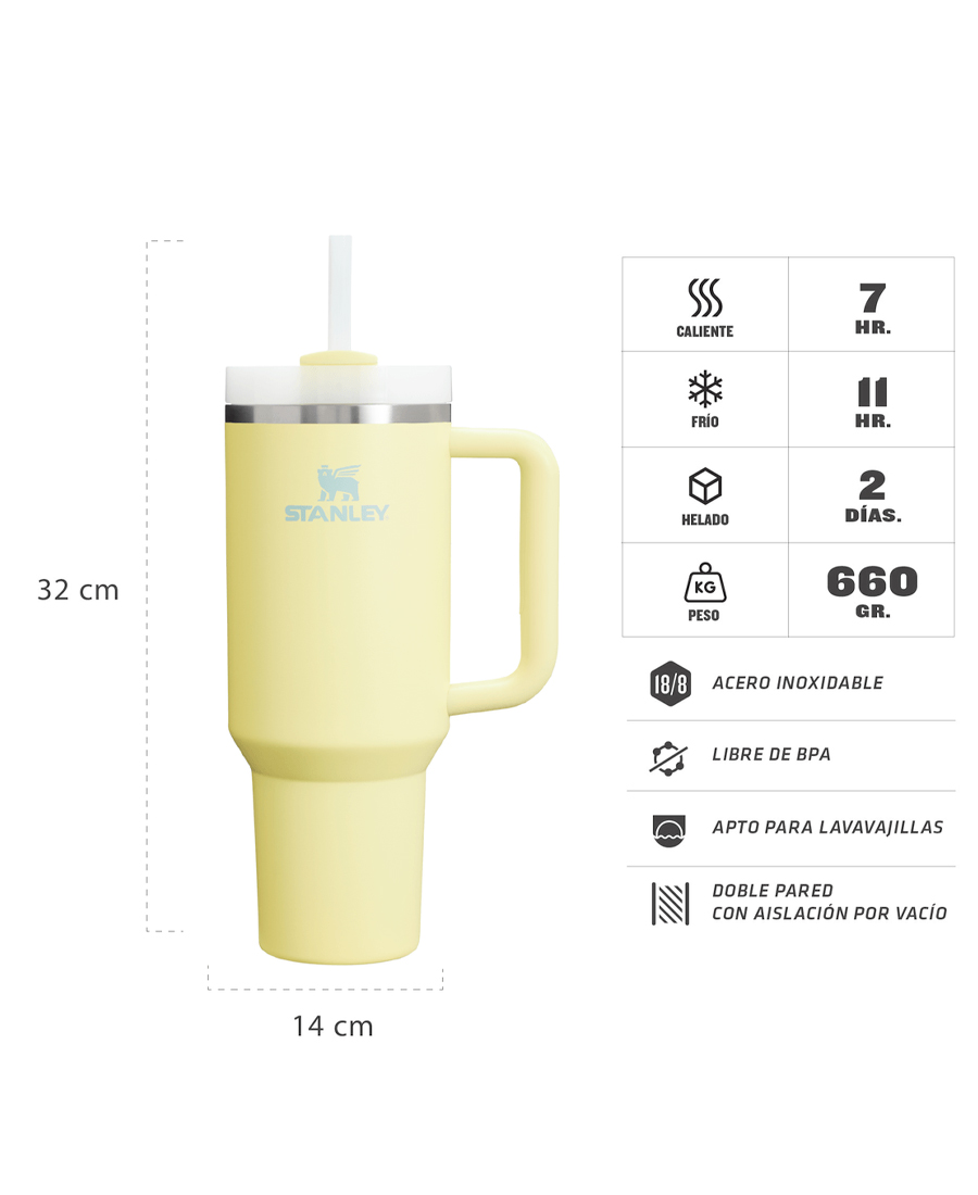 Vaso Stanley Quencher 1.18 Lts. Construido con acero inoxidable, nuestro vaso Quencher ofrece la máxima hidratación con menos recargas. Al ir al trabajo, al entrenamiento o a las excursiones de un día, querrás tener este vaso a tu lado. Gracias al aislamiento al vacío de Stanley, tus bebidas se mantendrán heladas, hora tras hora. La tapa FlowState™ avanzada cuenta con una cubierta giratoria con tres posiciones: una abertura diseñada para resistir las salpicaduras mientras mantiene el sorbete en su lugar, una abertura para beber y una tapa de cobertura completa. El asa ergonómica incluye inserciones de agarre cómodo para transportarlo con facilidad, y la base angosta se adapta a casi cualquier portavasos de vehículo.