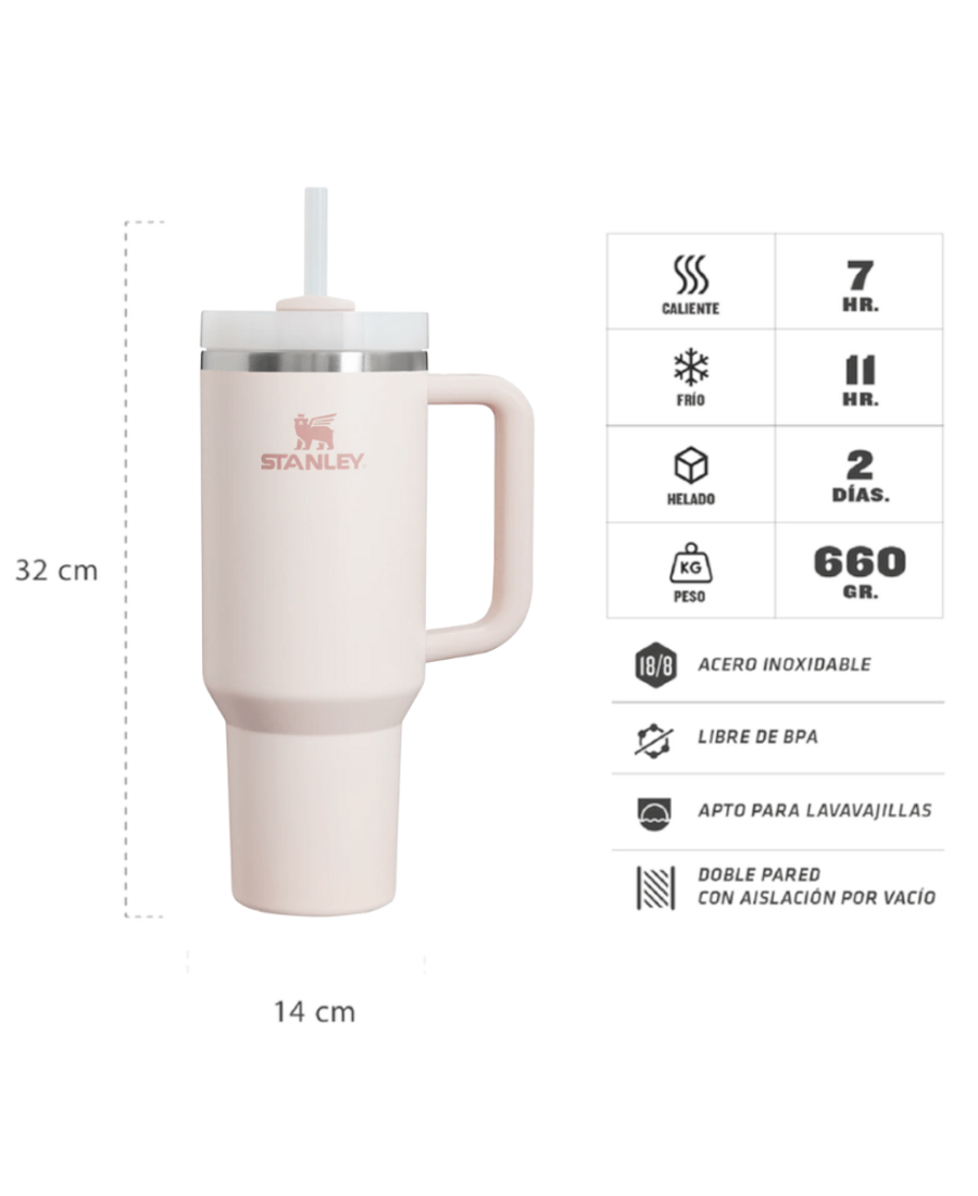 Vaso Stanley Quencher 1.18 Lts. Construido con acero inoxidable, nuestro vaso Quencher ofrece la máxima hidratación con menos recargas. Al ir al trabajo, al entrenamiento o a las excursiones de un día, querrás tener este vaso a tu lado. Gracias al aislamiento al vacío de Stanley, tus bebidas se mantendrán heladas, hora tras hora. La tapa FlowState™ avanzada cuenta con una cubierta giratoria con tres posiciones: una abertura diseñada para resistir las salpicaduras mientras mantiene el sorbete en su lugar, una abertura para beber y una tapa de cobertura completa. El asa ergonómica incluye inserciones de agarre cómodo para transportarlo con facilidad, y la base angosta se adapta a casi cualquier portavasos de vehículo.