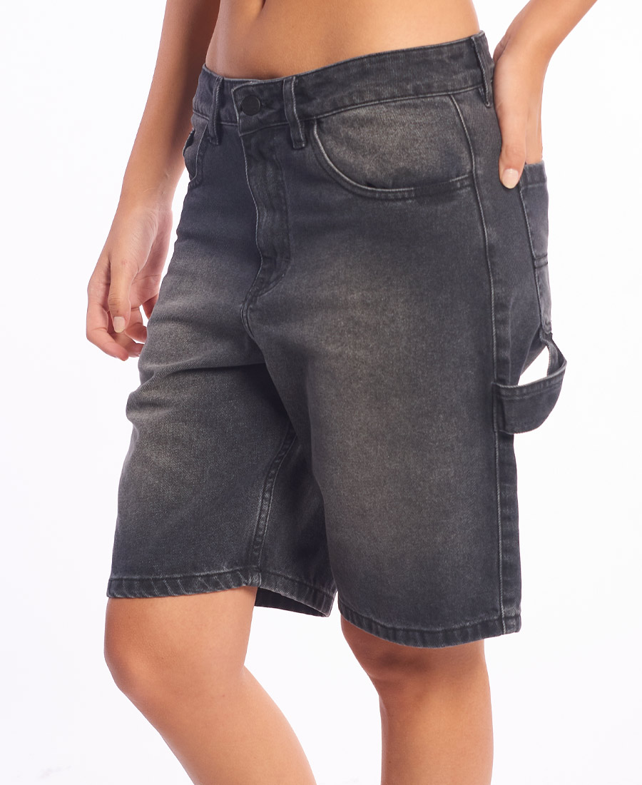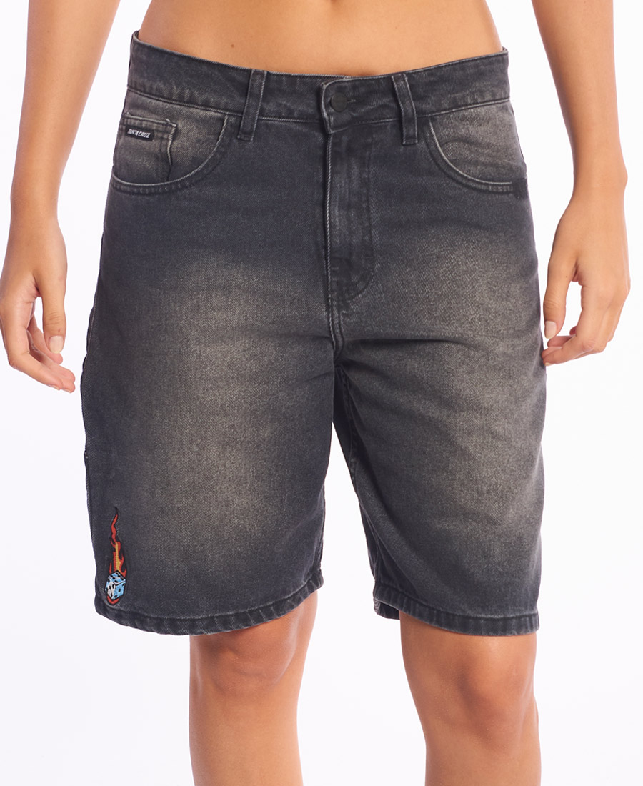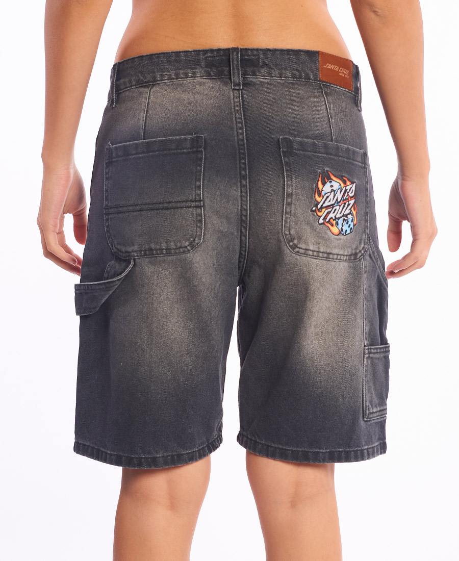 Bermuda Santa Cruz Flaming Dice Dot Carpenter. DENIM 10,8oz BLACK. 100% ALGODON. BAGGY FIT 18”. Etiqueta de marca/talle. Stone wash localizado. 5 bolsillos. Carpintero. Costuras, atraques y ojal a tono. Presillas de 1cm. Botón metálico marcario. Grifa de marca. Bordados y alegoria en bolsillos de espalda.