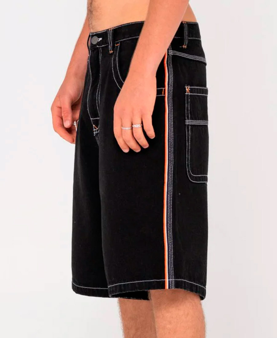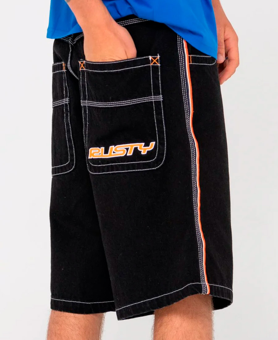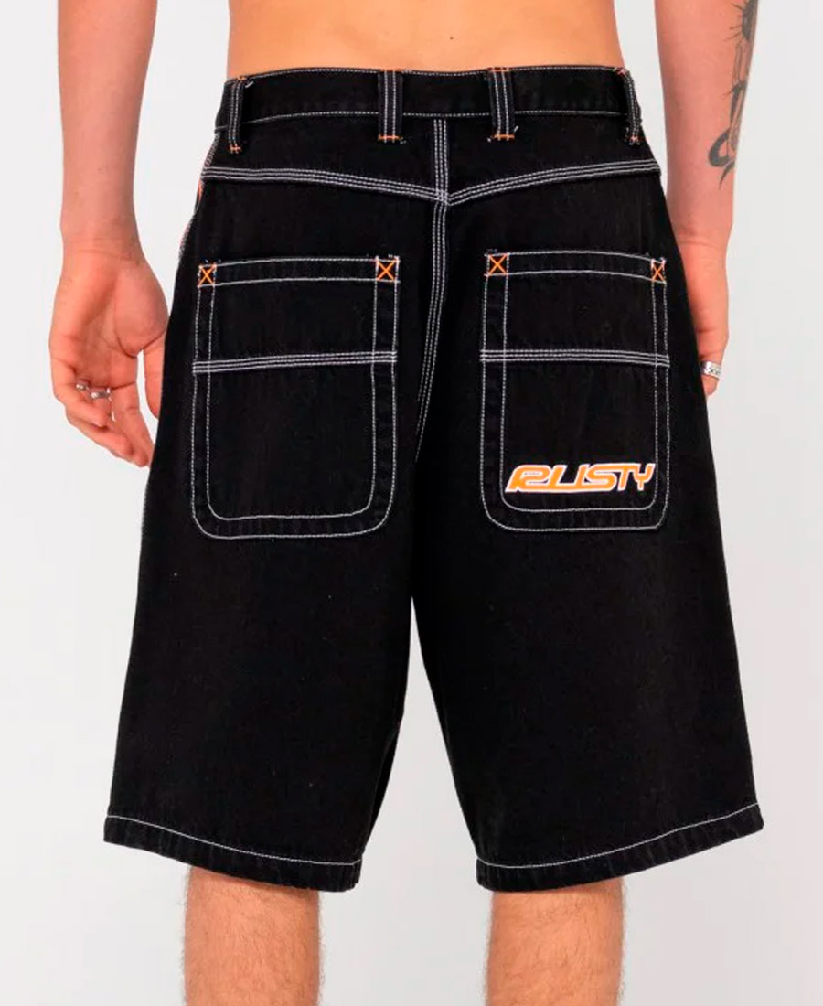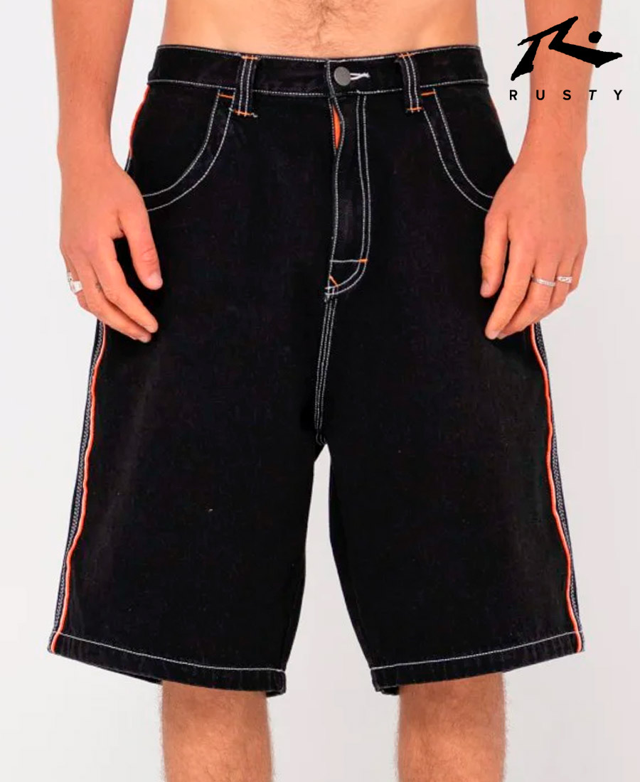 Bermuda Rusty Flip Daddy 2.Corte holgado/24 costuras exteriores con bordado oxidado (cintura ajustada). Material: Mezclilla - 100 % algodón Mezclilla negra - 12 oz