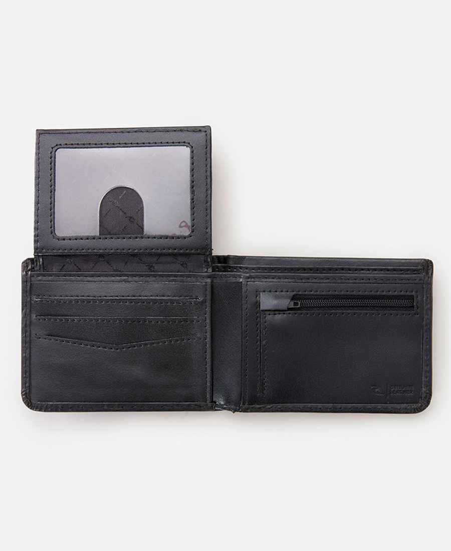 Billetera Rip Curl. Ventana de identificación. Protección RFID. Múltiples ranuras para tarjetas. Cuero. Ranura para monedas.
