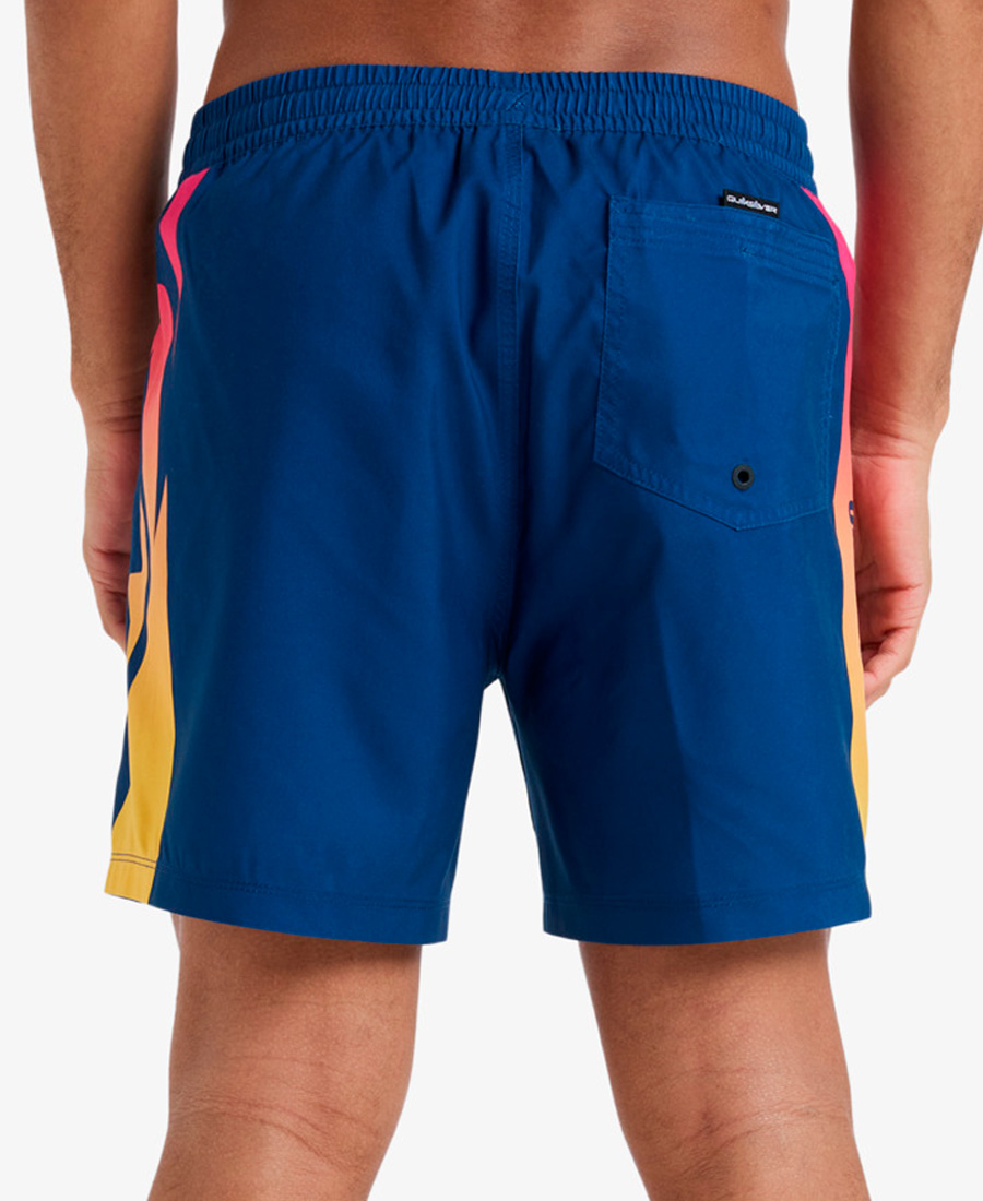 Boardshort Quiksilver Holmes Volley 16". Volley. Tejido: 100 % poliéster reciclado. Supersuede refabricado: Mantiene el nivel de rendimiento alto y la huella de carbono baja fabricado a partir de restos de producción y desechos textiles retirados, un paso más hacia la fabricación circular. Recubrimiento: Tratamiento hidrofóbico sin PFC. Fit: 16’. Cintura con elástico y cordón, cartera simulada. Recortes a contratano en ambas piernas, con estampas. Bolsillo trasero con loop interno para llaves y Grifa tirador.  100% Poliéster reciclado.