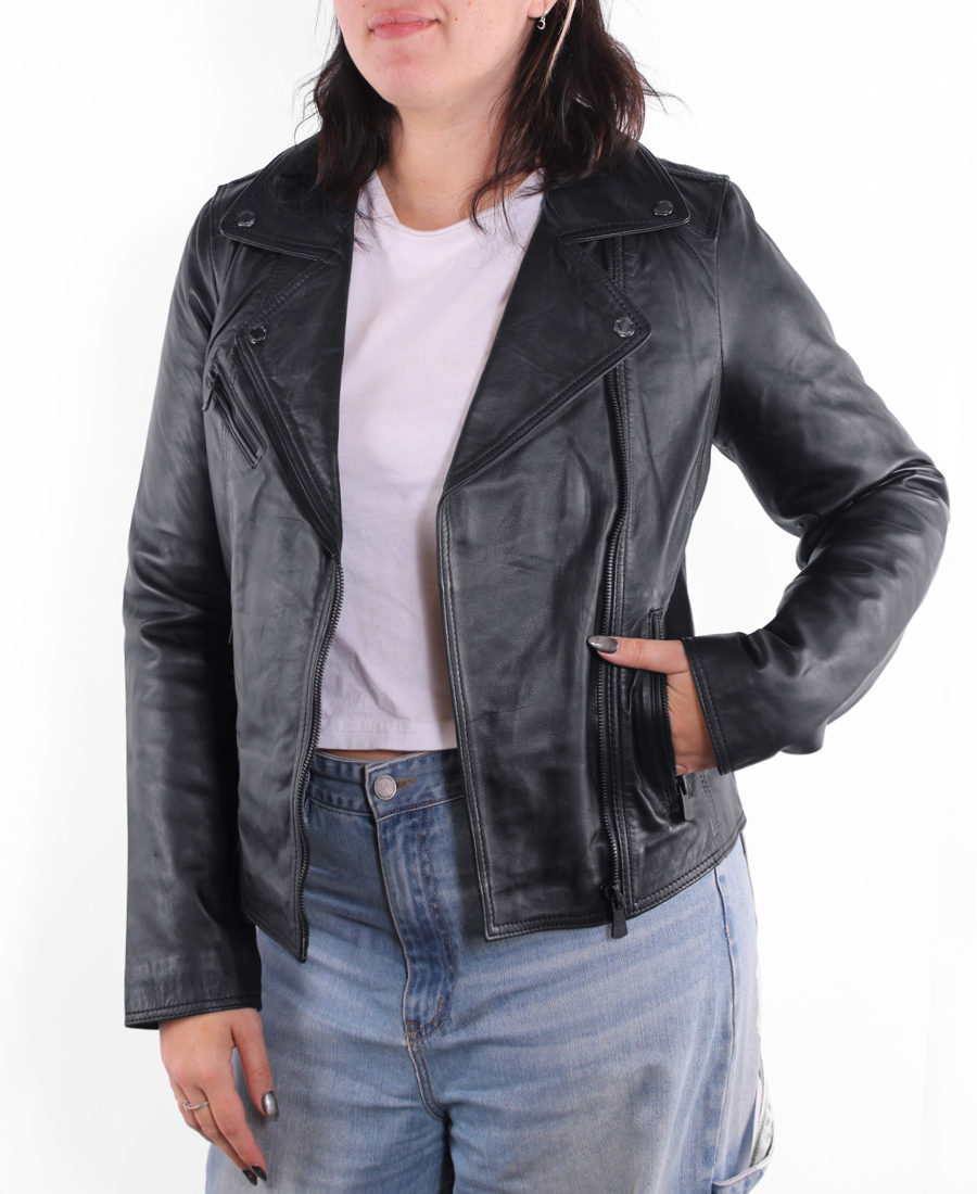 Campera Runway Alba. Prenda confeccionada en cuero natural de oveja (Sheep Eco). Cada pieza conserva las marcas y variaciones de tono propias del cuero auténtico, aportando carácter y singularidad sin afectar la durabilidad.