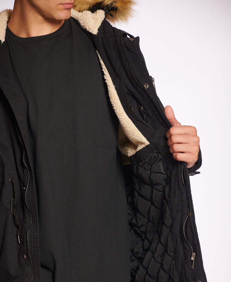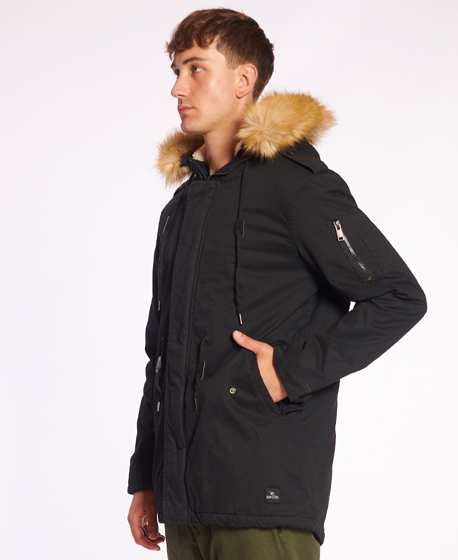 Campera Rip Curl Parka. Microfibra twill. Parka larga con inerior en corderito en medio torso, piel sintetica desmotable en capucha. Interior de capucha con corderito. Multietiquetas. 100% algodón (capucha No desmontable)