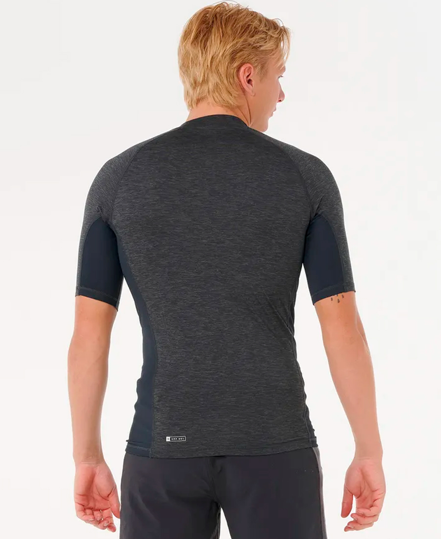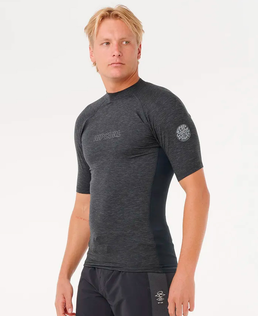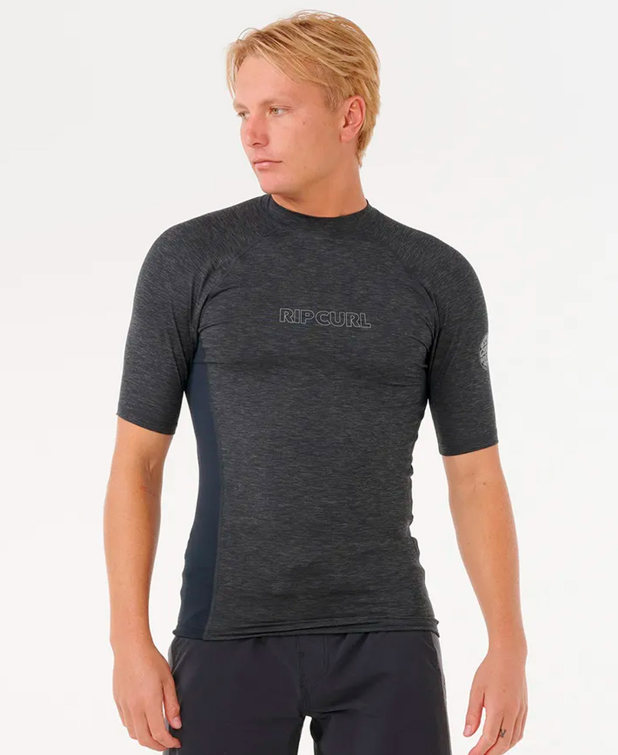 Lycra Rip Curl Perf Dawn PUV50. STRETCH POLYESTER HORIZONTAL M. PERFORMANCE FIT. Transferencia térmica. Estampado frontal y en las mangas. Anillo elástico para boardshorts. Rash vest con protección solar UPF 50+. 100% Poly.