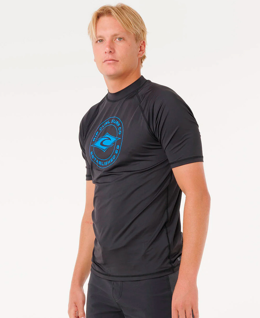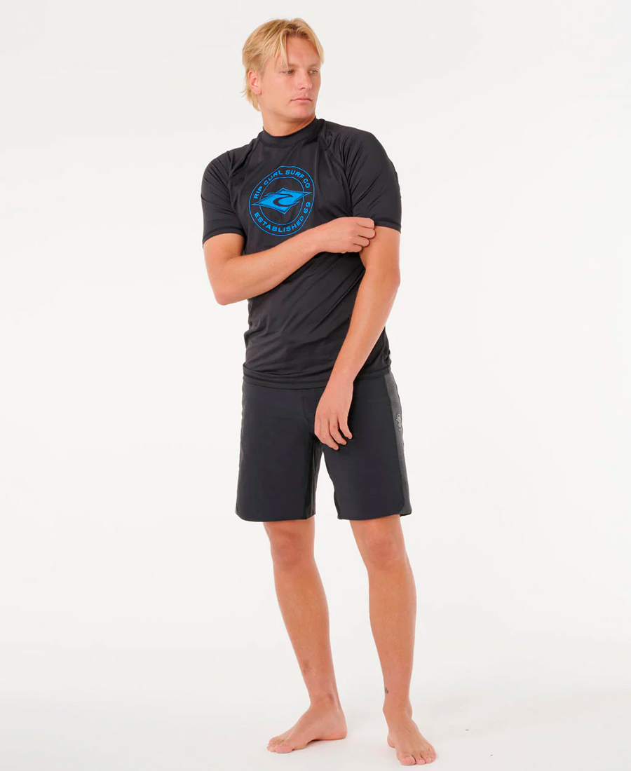 Lycra Rip Curl Stapler UV50. STRETCH RECYCLED POLYESTER 180G. RELAXED FIT. Transferencia térmica. Estampado frontal y en las mangas. Detalles con costura flatlock. Elástico para boardshorts. Rash vest con protección solar UPF 50+. Resistente al cloro. Producido de manera responsable. 100% Poly.