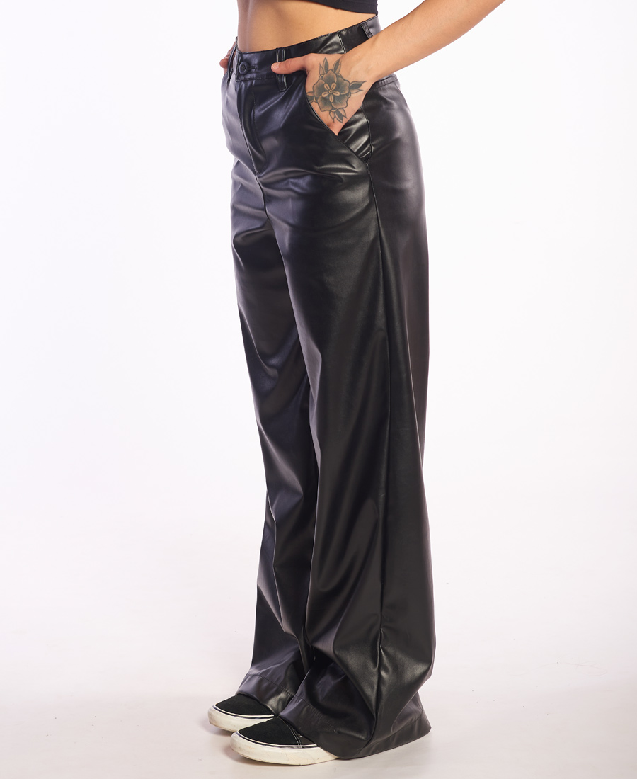 Pantalón recto de cuerina lisa, straight, bolsillos laterales. Avíos marcarios.