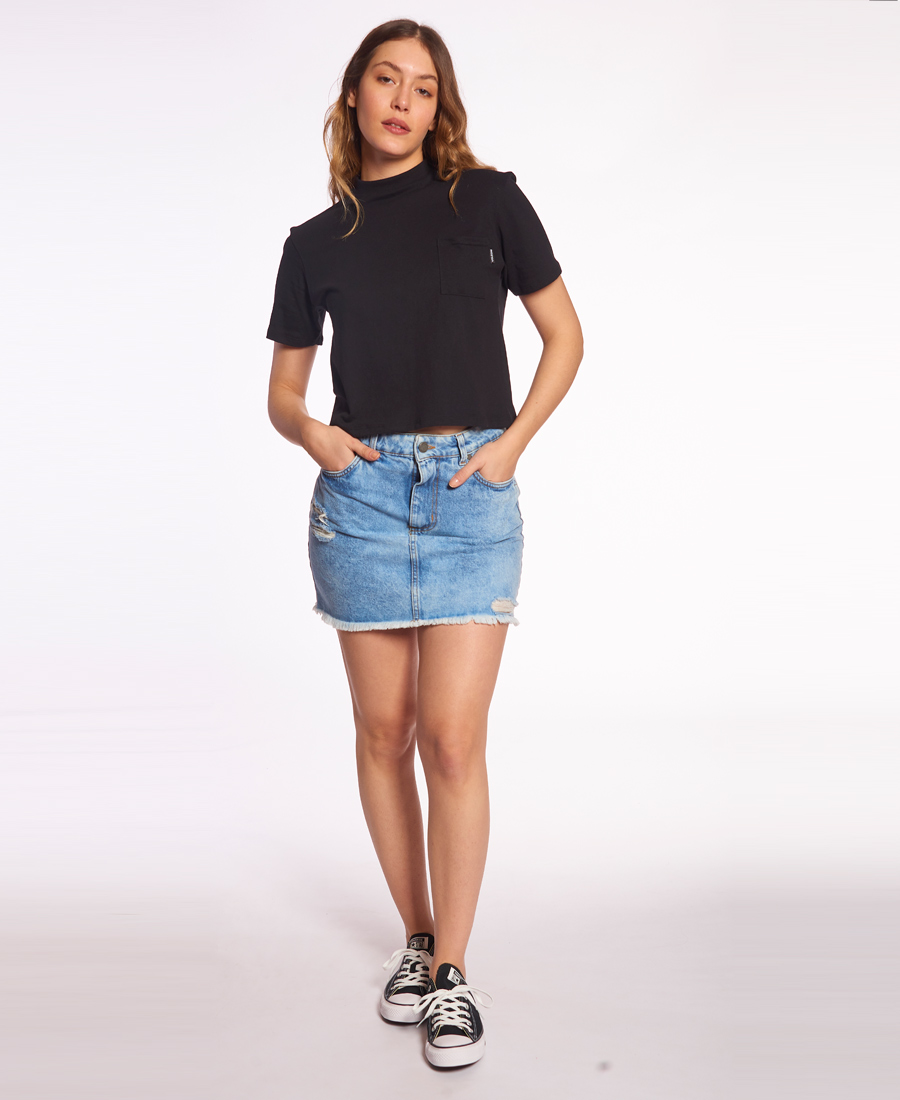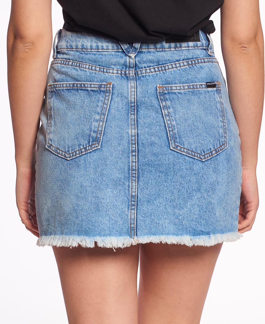 Pollera Volcom Stokek Blue. Pollera de denim tiro alto con lavado gastado y roturas. Grifa volcom en trasero. Denim 100% Algodón. Denim 100% algodón.