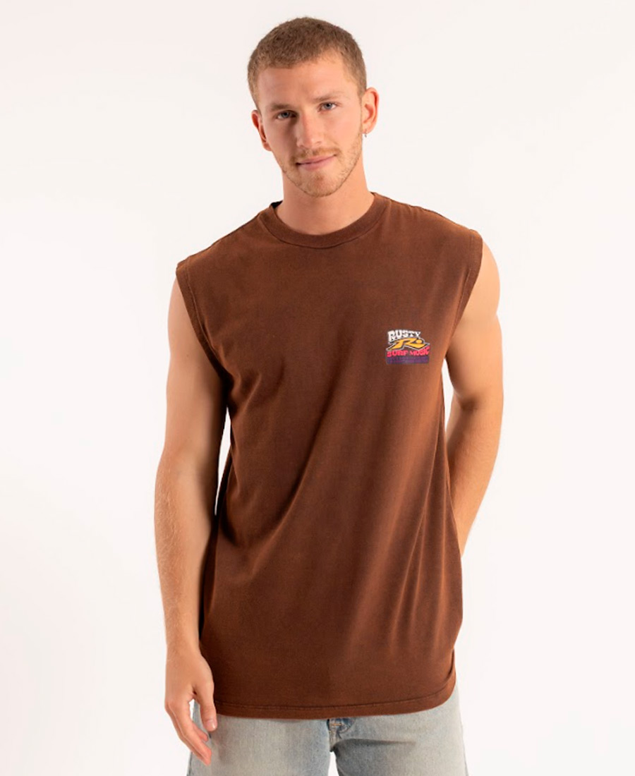 Remera Rusty STP Muscle Process. Sin mangas. Relax Fit. Lavado process. Estampa en delantero chico y en espalda grande. Grifa Rusty. 100% algodón.